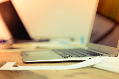 A tidy workspace featuring a laptop, coffee cup, phone, and notepad on a wooden desk.